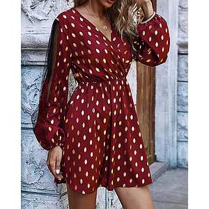 Vestido corto informal de encaje con manga larga para otoño, minivestido ceñido con lunares para mujer, cuello en V, costura de retazos