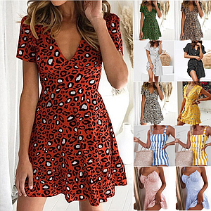 Vestido con estampado de leopardo de verano con volantes de manga corta con cuello en V para fiesta de noche dulce Vestido de playa 2020 verano