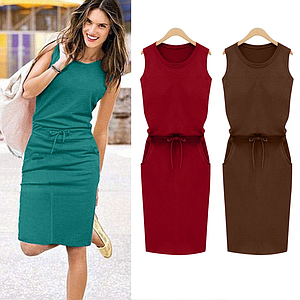 Sexy mujer moda sin mangas Color sólido Casual bolsillo suelto vestido de verano