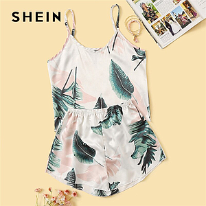 SHEIN estampado Tropical Conjunto de pijama de satén mujer verano Casual sin mangas Spaghetti Correa ropa de dormir lindo fresco niñas ropa de dormir