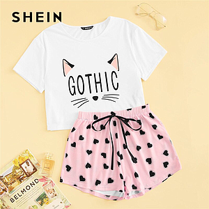 SHEIN estampado de gato camiseta y corazón pantalones cortos de cintura elástica Casual ropa de dormir mujeres verano lindo cuello redondo manga corta Conjunto de pijama