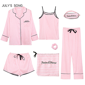 Conjuntos de pijamas de 7 piezas de JULY'S SONG Pink para mujer, pijama rayada de seda con emulación, ropa de dormir para mujer, conjuntos para primavera, verano y otoño