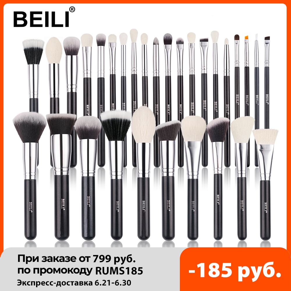 Conjunto de negras brochas maquillaje BEILI, brochas profesionales de pelo Natural de cabra, brochas para base de maquillaje en polvo, brochas para mezclar ojos y maquillaje