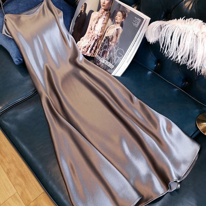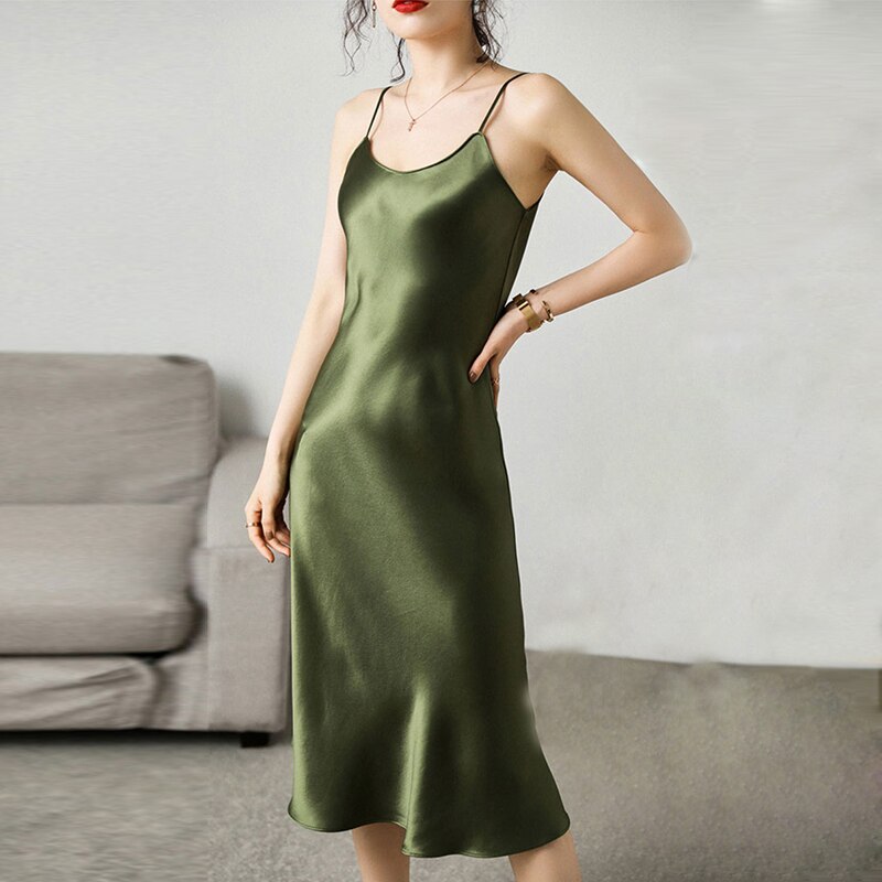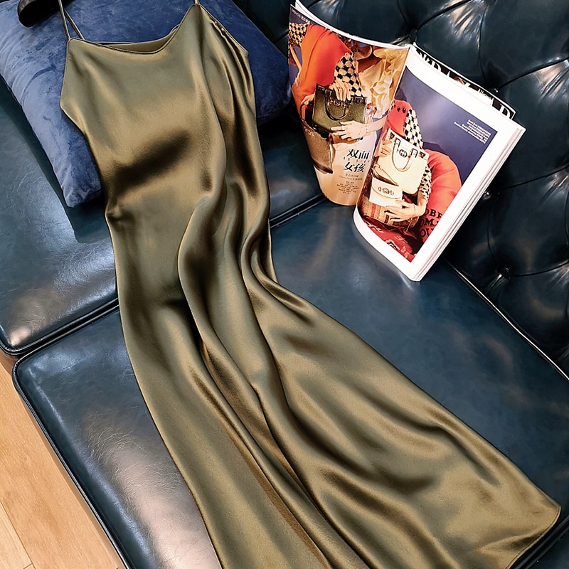 Cuello en V Sexy vestido de verano de las mujeres sin mangas 2021 de talla grande Midi Vestido de satén correa de espagueti Vestidos de las señoras Vestidos 13115