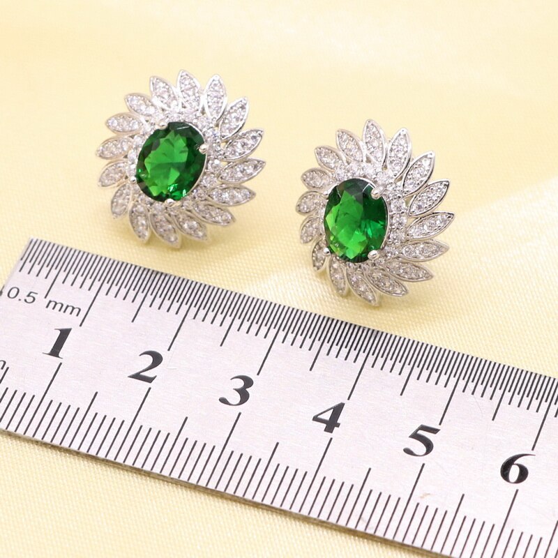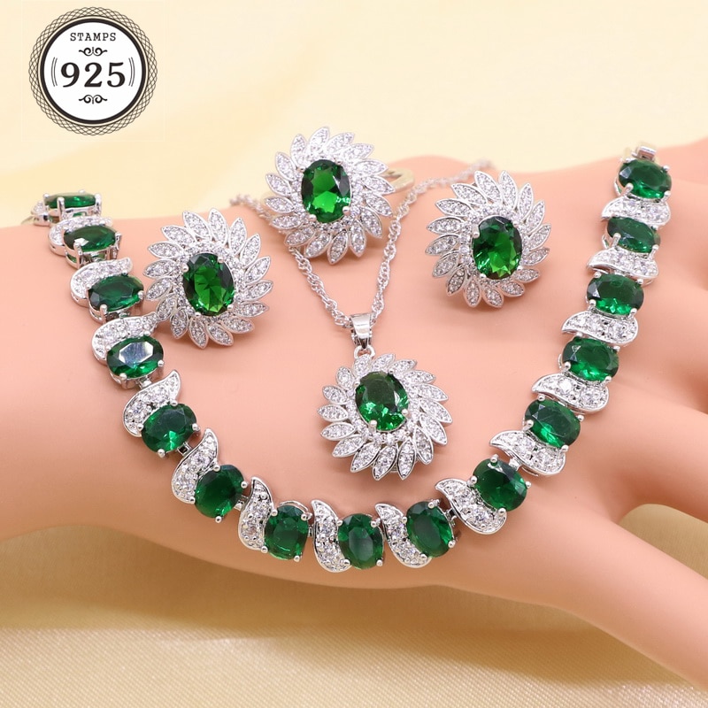 Juego de joyas de imitación de Esmeralda verde para mujer, cristal blanco, circonia, color plateado, conjuntos de joyería nupcial, collar, pendientes, anillo y pulsera