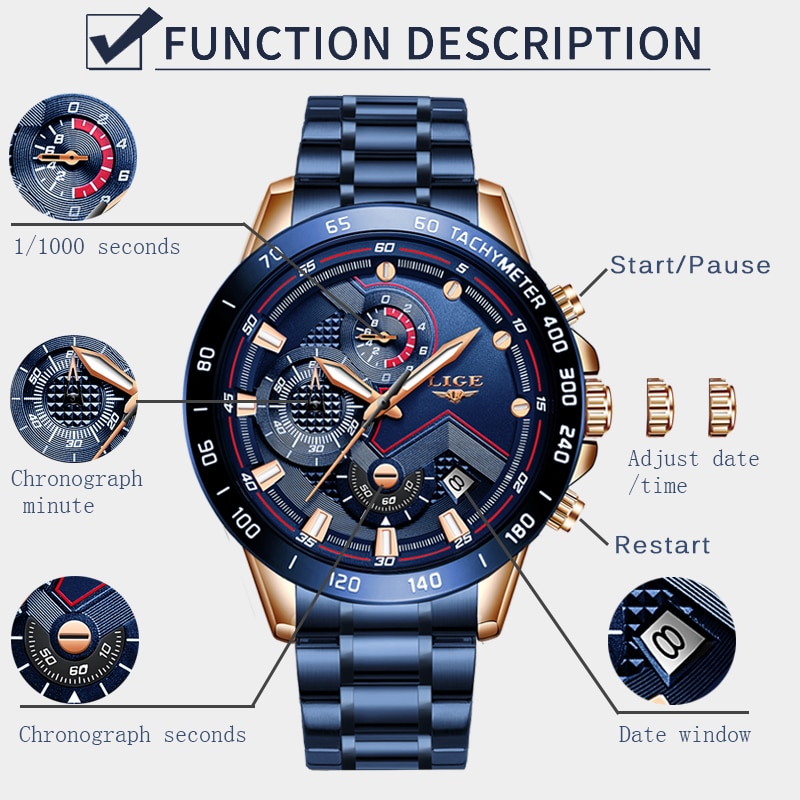 LIGE-Reloj de lujo para hombres, reloj de pulsera de acero inoxidable azul, cronógrafo militar, de cuarzo, Masculino