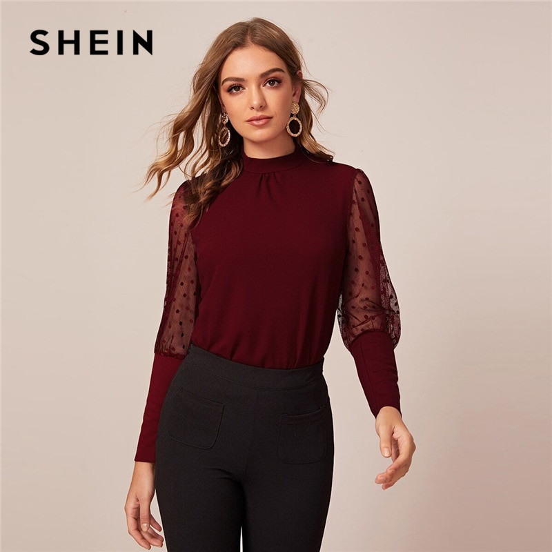 SHEIN Dobby Top de malla de pierna de cordero, manga para mujeres, primavera Otoño, ojo de cerradura, sólido, cuello levantado, blusas y Tops