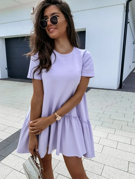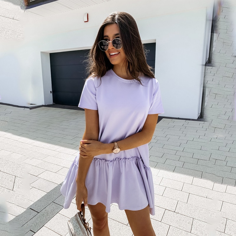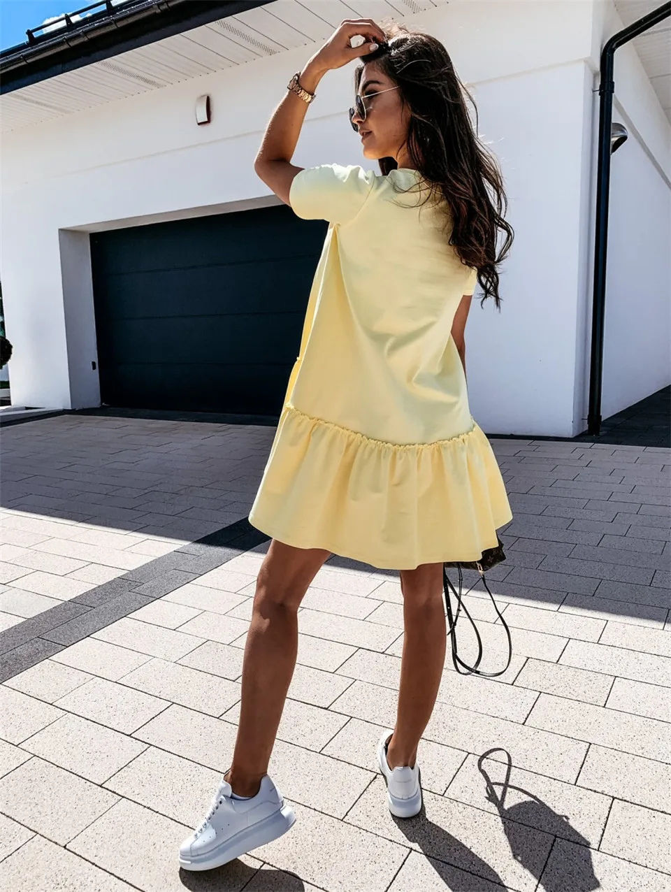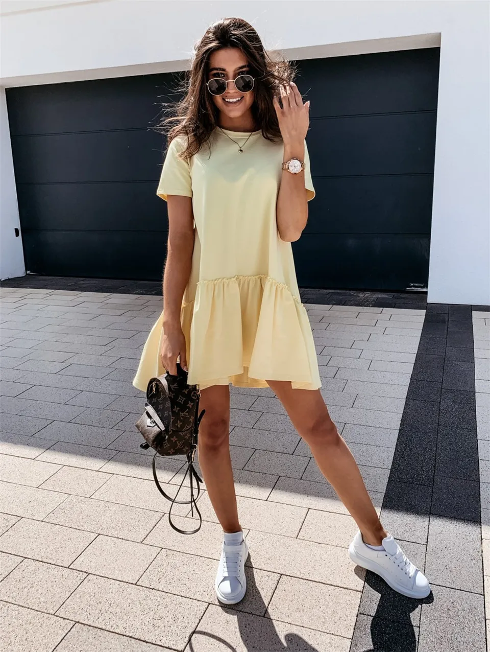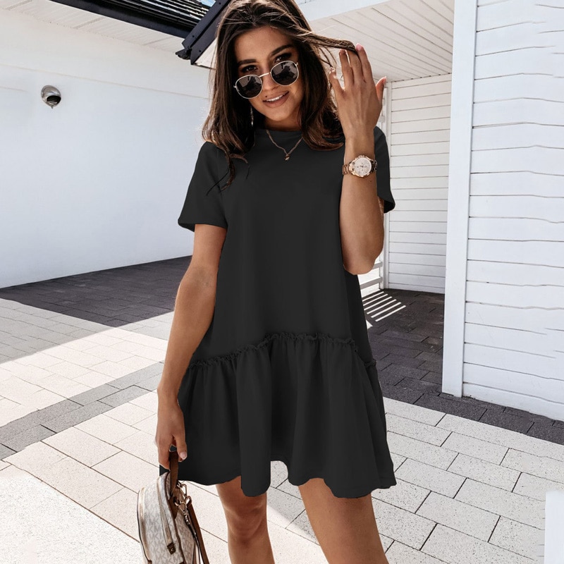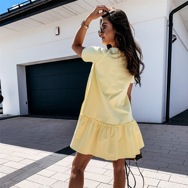 Vestido corto holgado informal de verano con volantes y cuello redondo, minivestido Sexy para mujer, Color liso