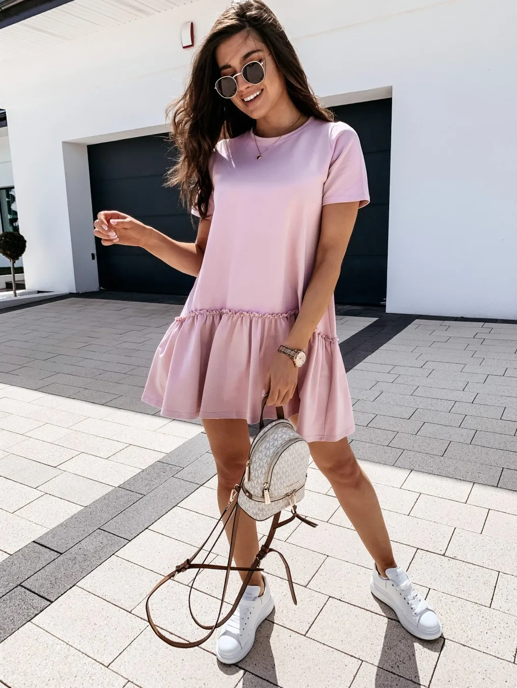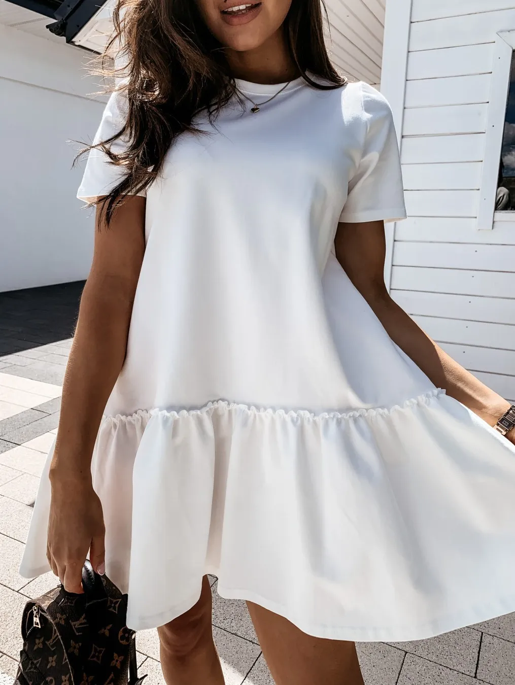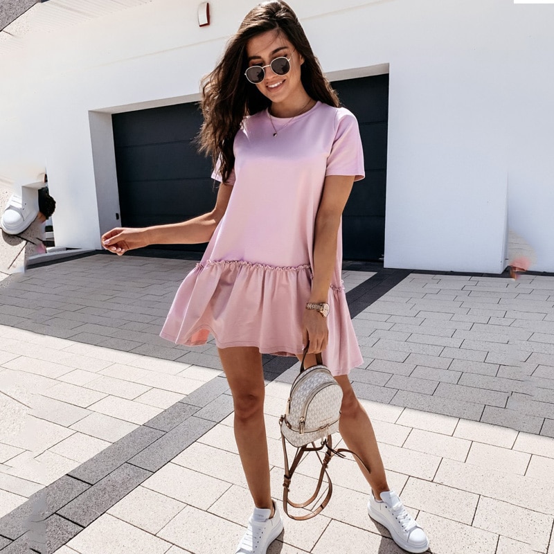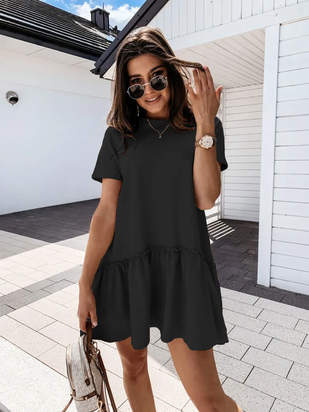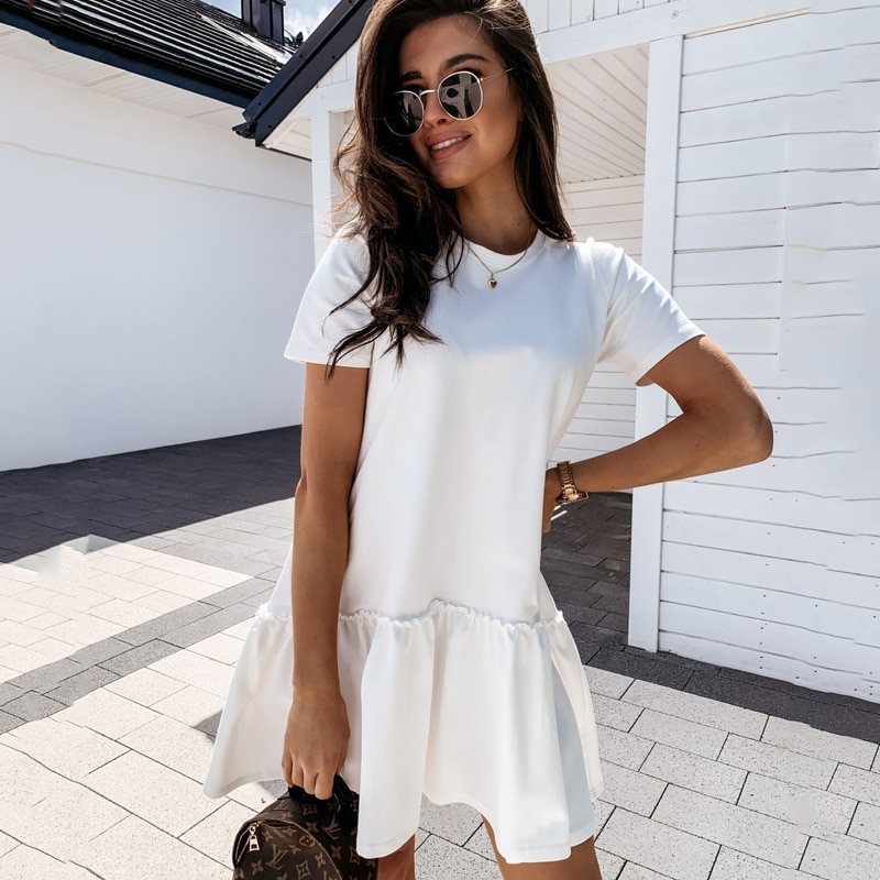 Vestido corto holgado informal de verano con volantes y cuello redondo, minivestido Sexy para mujer, Color liso