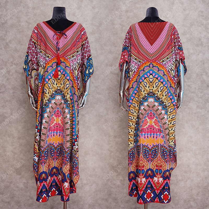 Vestido de verano largo de secado rápido con estampado bohemio, caftán, túnica roja, para playa, Q897, 2021