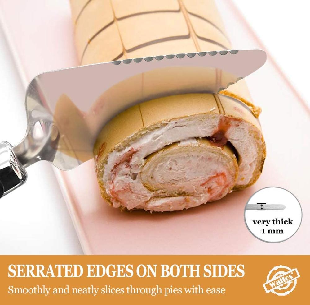1. HIGH QUALITY & PROFESSIONAL PIE SERVER - Walfos pizza cutter pie server is made of Food grade 430 stainless steel, serrated edges on both sides can makes a clean cut in any crust, stay sharp and resist rust. Very strong, built to last.The wheel adopts one-piece riveting process make it very strong.