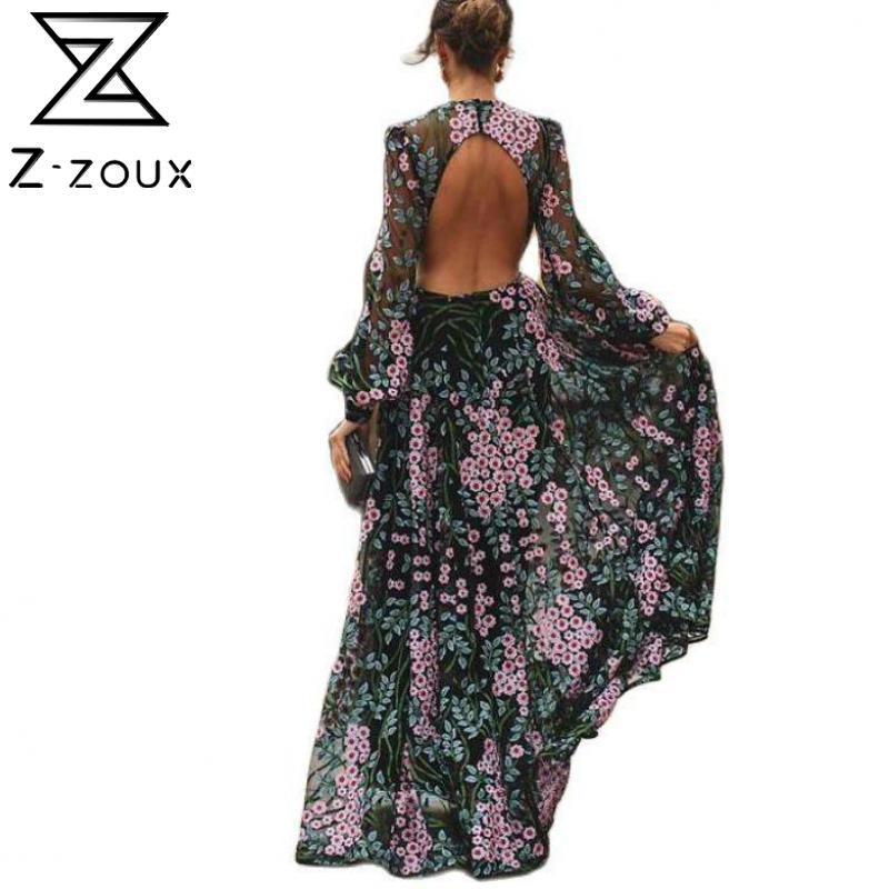 Z-zoux-vestido bordado de manga larga para mujer, vestidos estampados de talla grande, perspectiva hueca, vestidos de flores largas, moda 2020